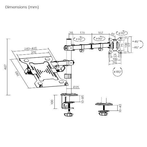 For people who work with both monitors and laptops, the DM-345 is the perfect choice. It allows for independent adjustment of each monitor and provides optimal viewing angle by positioning two screens at the same level. The durable steel structure accommodates 17”-32” monitors up to 9kg(19.8lbs) and 10”-15.6” laptops up to 4kg(8.8lbs). The monitor arm incorporates a detachable VESA plate for user-friendly installation and cable clips for clutter-free workplace.