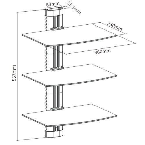 Protech DVD-103 is a single-column AV component system that mounts directly under wall-mounted TVs for a sleek, streamlined look. Its thick tempered glass can hold up to 8kg/17.6lbs of DVD players or most any other AV components. The tempered glass shelf to be installed on the shelf holder can be vertically adjusted along the aluminum wall plate to accommodate any AV component arrangement. The center column features two integrated channels for easy power cable and signal wire routing.