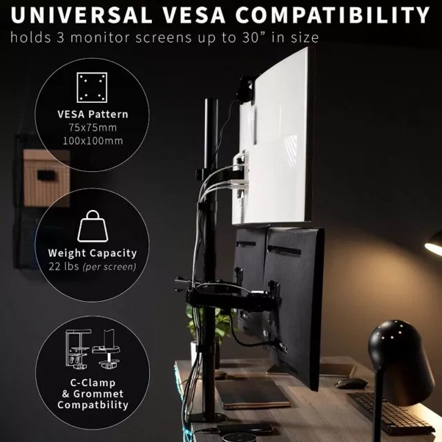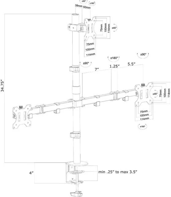 The Protech DM-341 is specially designed to Mount three monitors up and side by side for easiest viewing angel. Constructed of high grade steel, this rugged mount built to resist scratches and supports screens up to 8kg/17.6 lbs. and 32″ in size. We made a detachable VESA panel, just simply screw the monitor on the panel and slide back to the mount. Full motion structure allows smooth, effortless rotating and positioning to find the perfect viewing angle. You can also adjust the monitor height vertically to a desired position. Besides, cable clip is included for keeping cables organized and protected. Please refer to product diagram for further details.