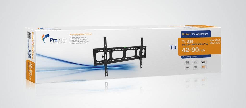 ProTech TL-226 is design to fit most 42″-90″ LED, LCD Flat Panel TVs up to 75kgs/165lbs. A tilting mount is recommended when reflections from windows or lighting interfere with TV viewing or when multiple viewing angles are desired. Adjustable structure allows freely tilting for 15°up and 15°down for viewing ease and enjoyment. Lateral shift allows the TV to move left and right on the wall plate so it’s placed exactly where you want it. Compatible with VESA hole up to 800×400. Protech TL-226 is specially design to fit on 3 studs to give more support for heavier Plasma TVs.